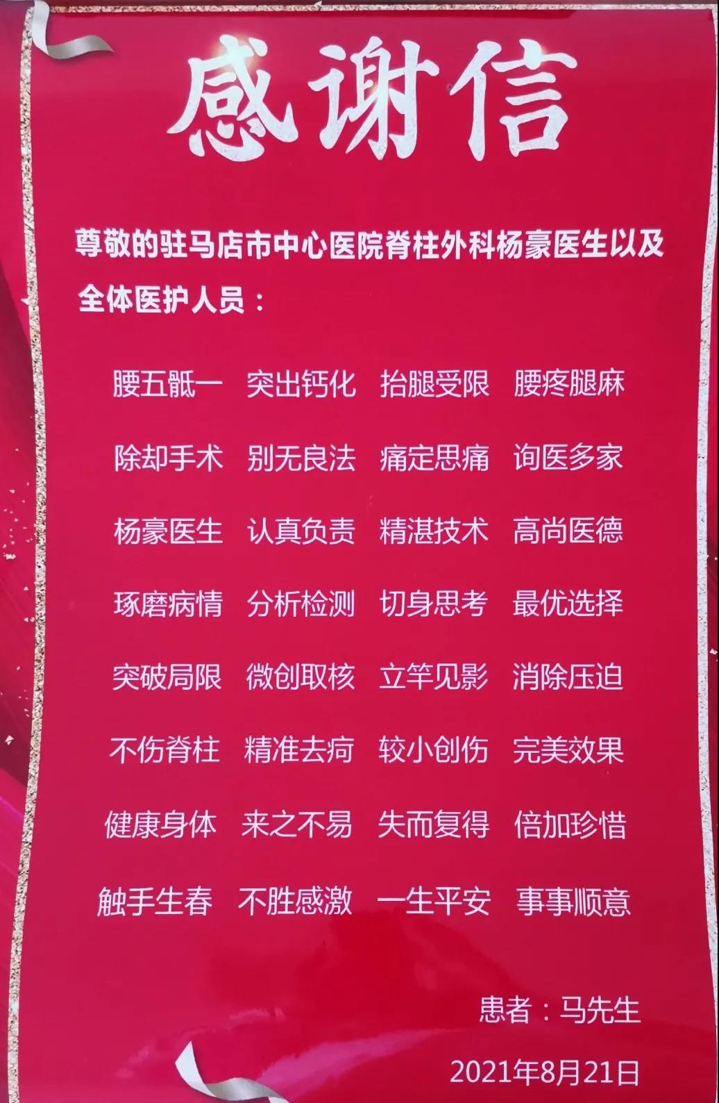 欽佩楊豪的精湛技術,馬先生出院后將自己精心準備的一首打油詩制成錦旗,專程送到醫(yī)院來表達感謝,而這一天恰巧是第四屆醫(yī)師節(jié)。楊豪坦言:作為一名醫(yī)生,能得到患者的認可,是最為可貴的禮物。