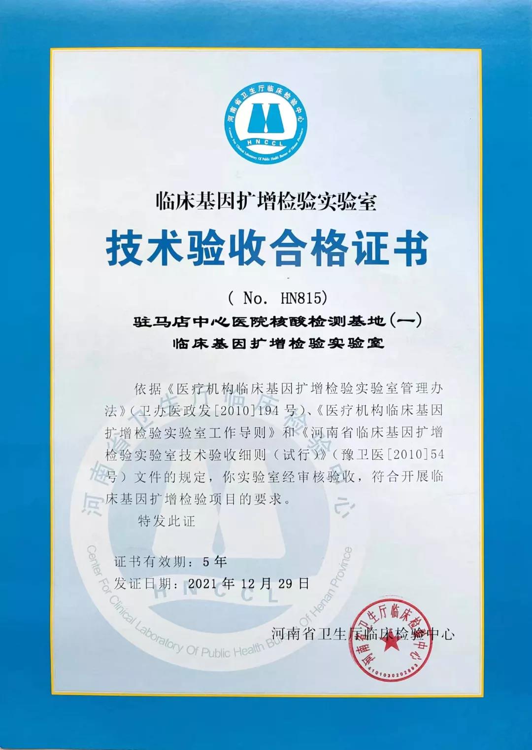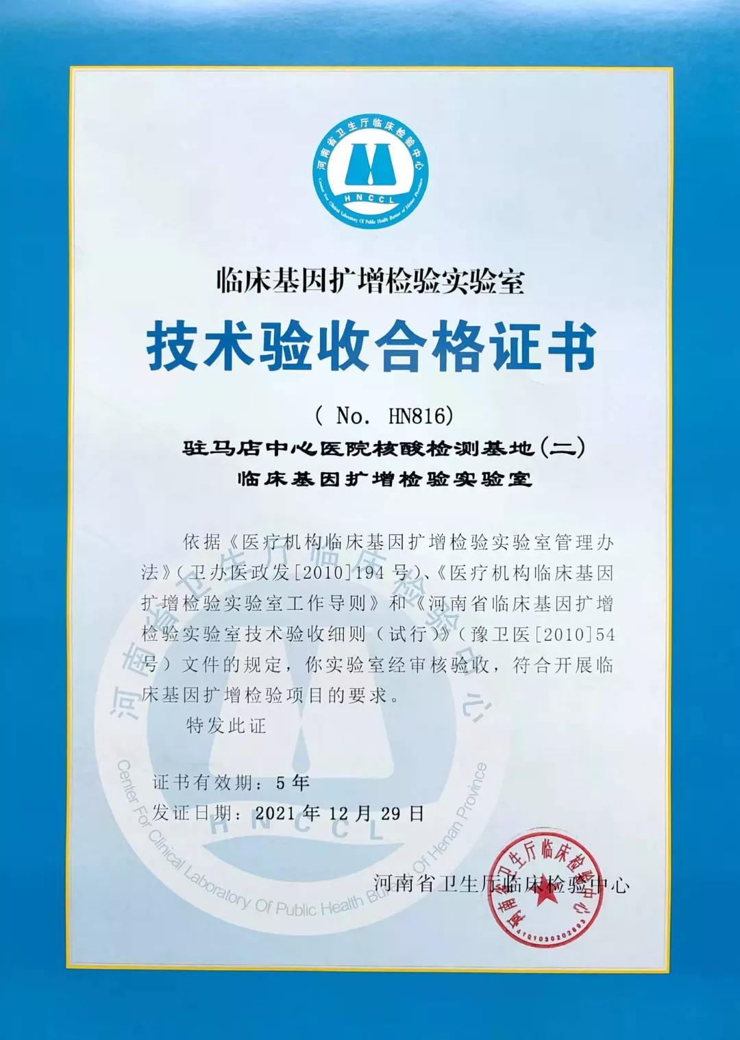 近日,駐馬店市中心醫(yī)院婦女兒童醫(yī)院醫(yī)學(xué)檢驗科臨床基因擴增檢驗實驗室暨駐馬店城市大規(guī)模核酸檢測基地通過河南省臨床檢驗中心驗收,被授予技術(shù)驗收合格證書。