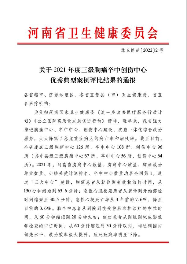 近日,河南省衛(wèi)健委公布《關(guān)于2021年度三級胸痛、卒中、創(chuàng)傷中心優(yōu)秀典型案例評比結(jié)果的通報》,駐馬店市中心醫(yī)院斬獲佳績。