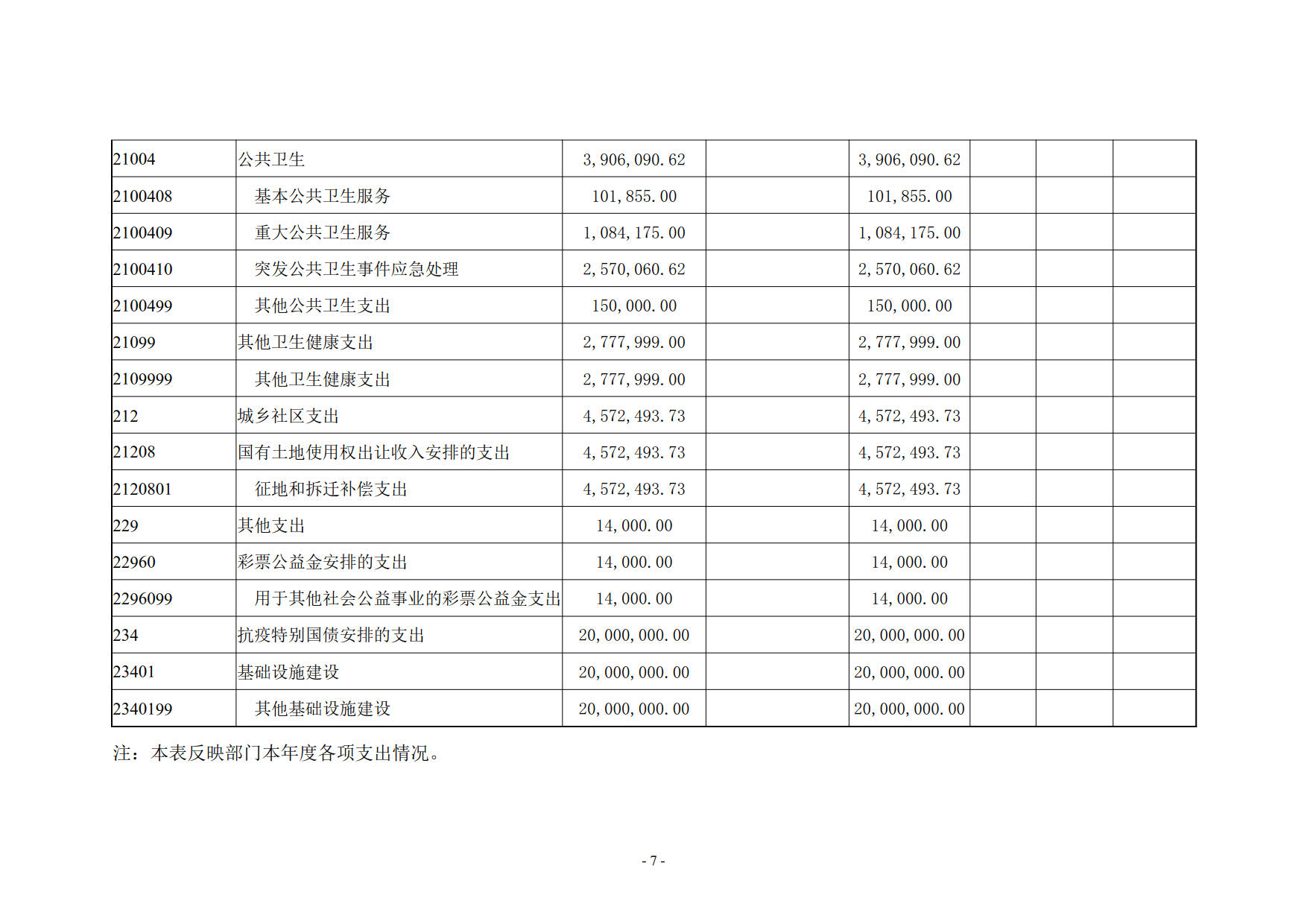 6.衛(wèi)生健康支出(類)公共衛(wèi)生(款)重大公共衛(wèi)生服務(wù)(項(xiàng))。年初預(yù)算為70.88萬元,支出決算為108.42萬元,完成年初預(yù)算的152.96%。決算數(shù)與年初預(yù)算數(shù)存在差異的主要原因是本年支出中使用的有上年度結(jié)轉(zhuǎn)資金。