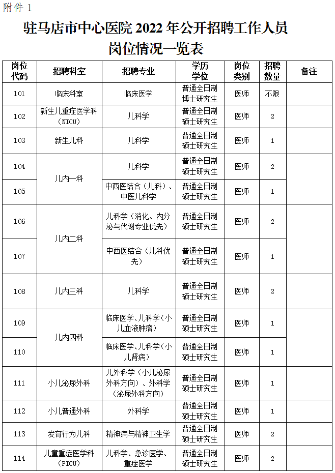 附件:1.《駐馬店市中心醫(yī)院2022年公開招聘工作人員崗位情況一覽表》