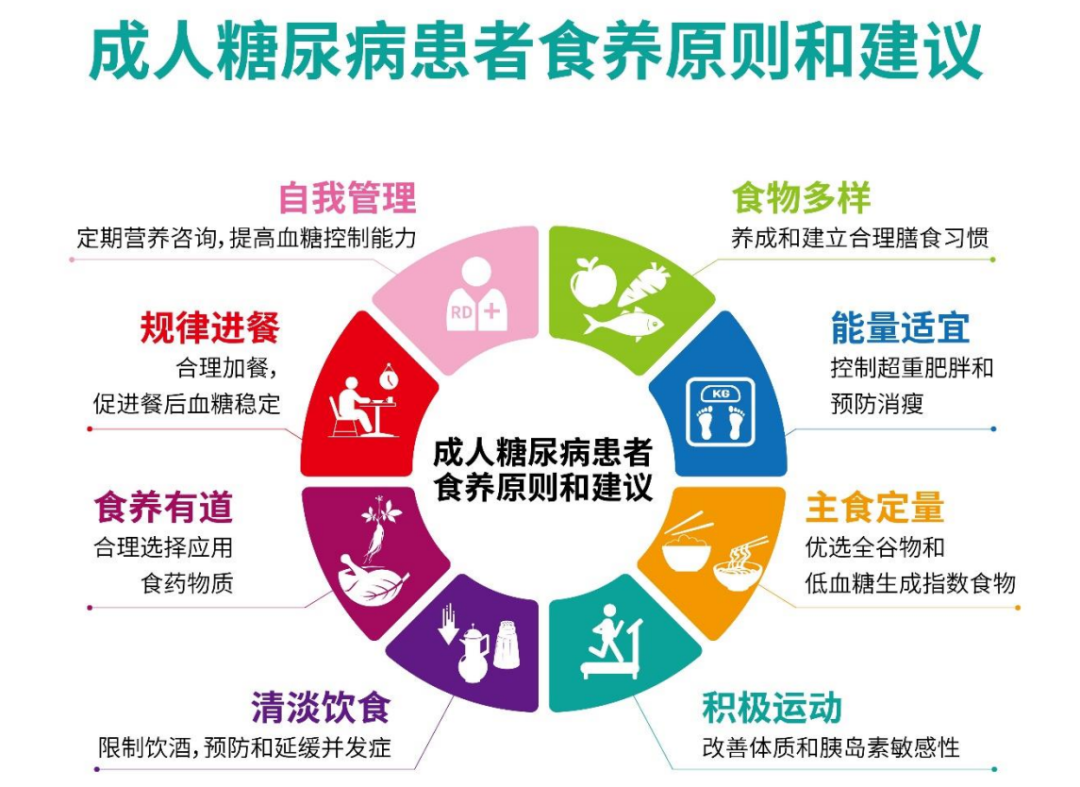 對(duì)糖尿病患者的日常食養(yǎng)提出8條原則和建議如下圖:
