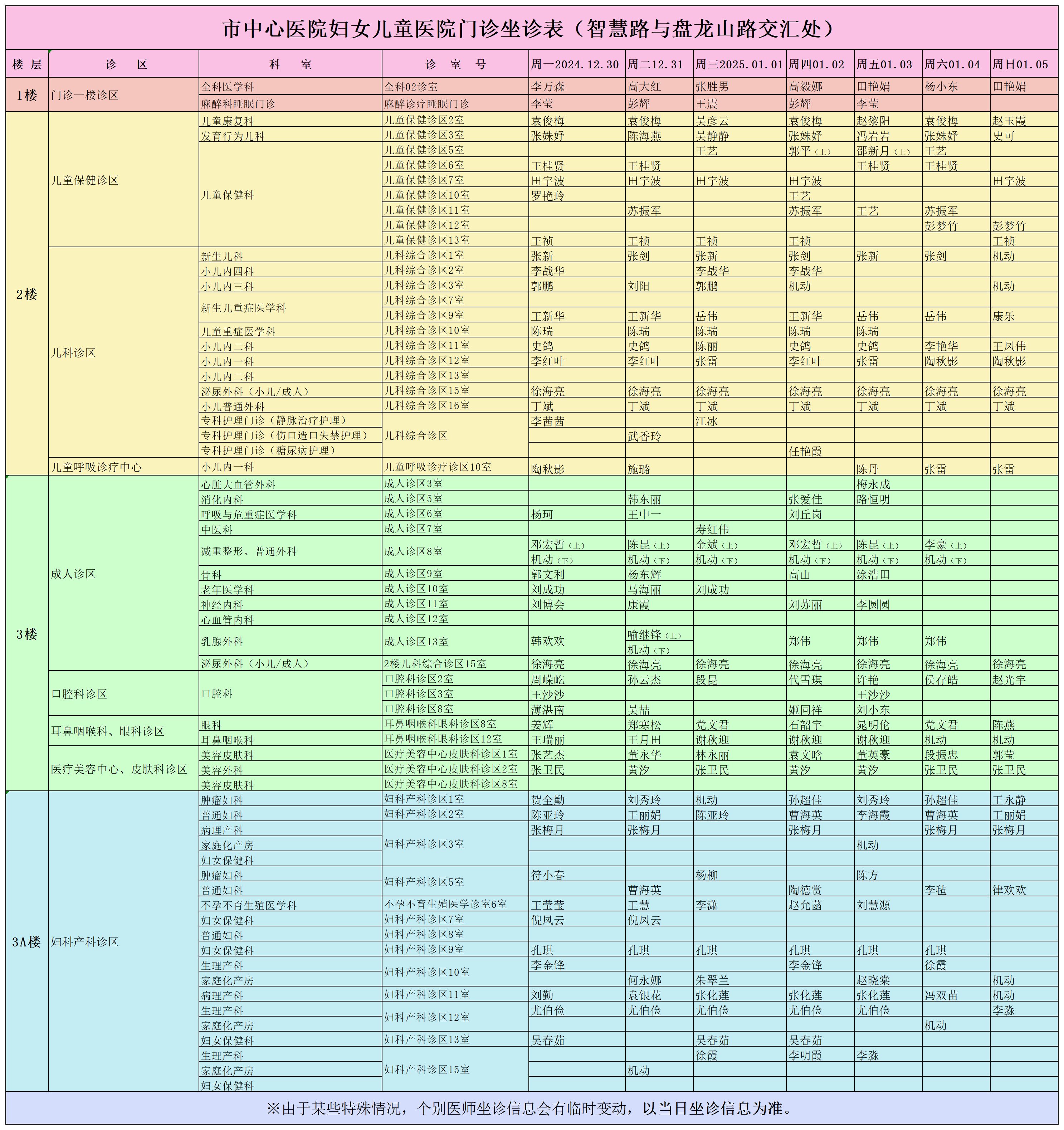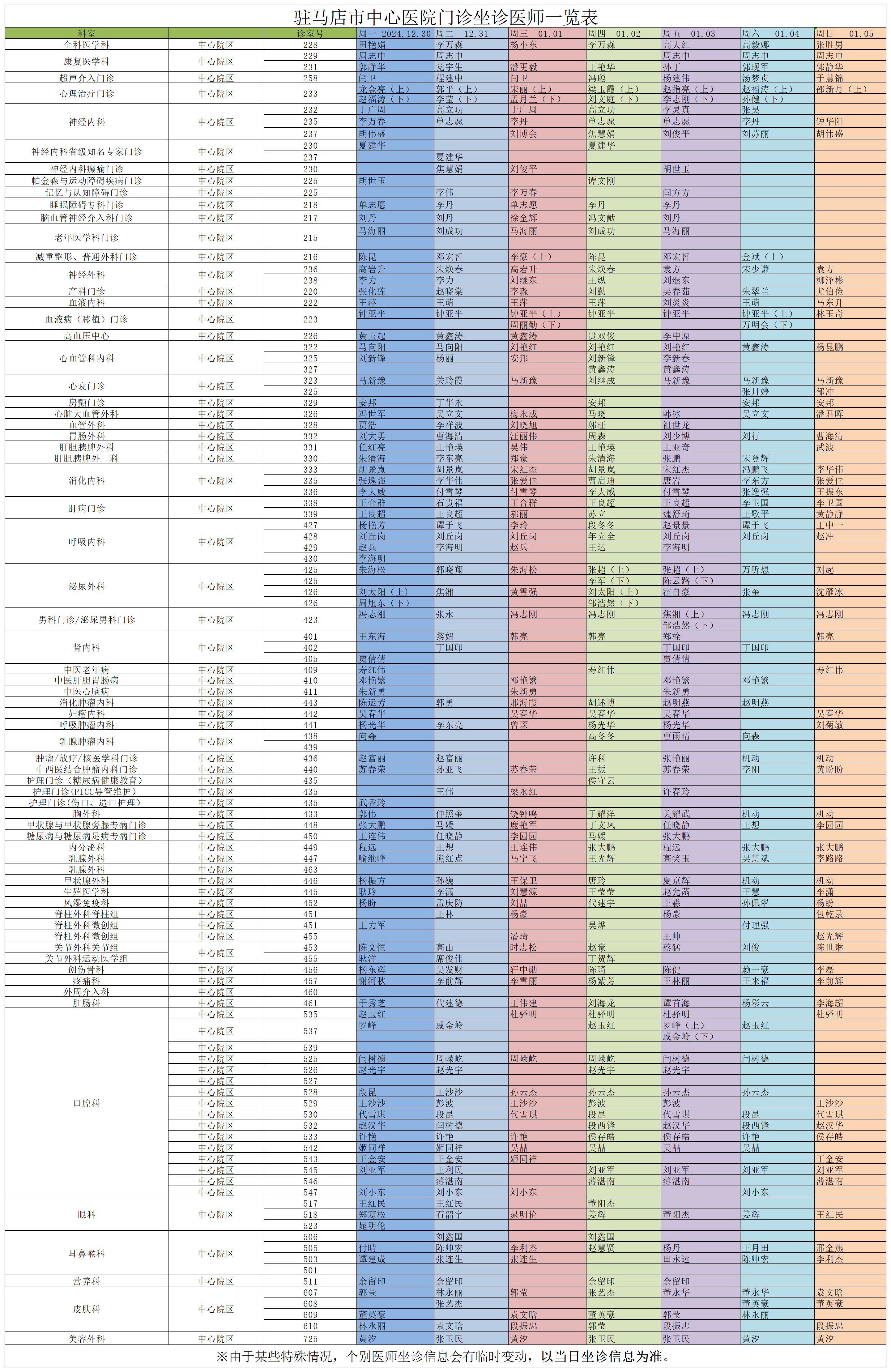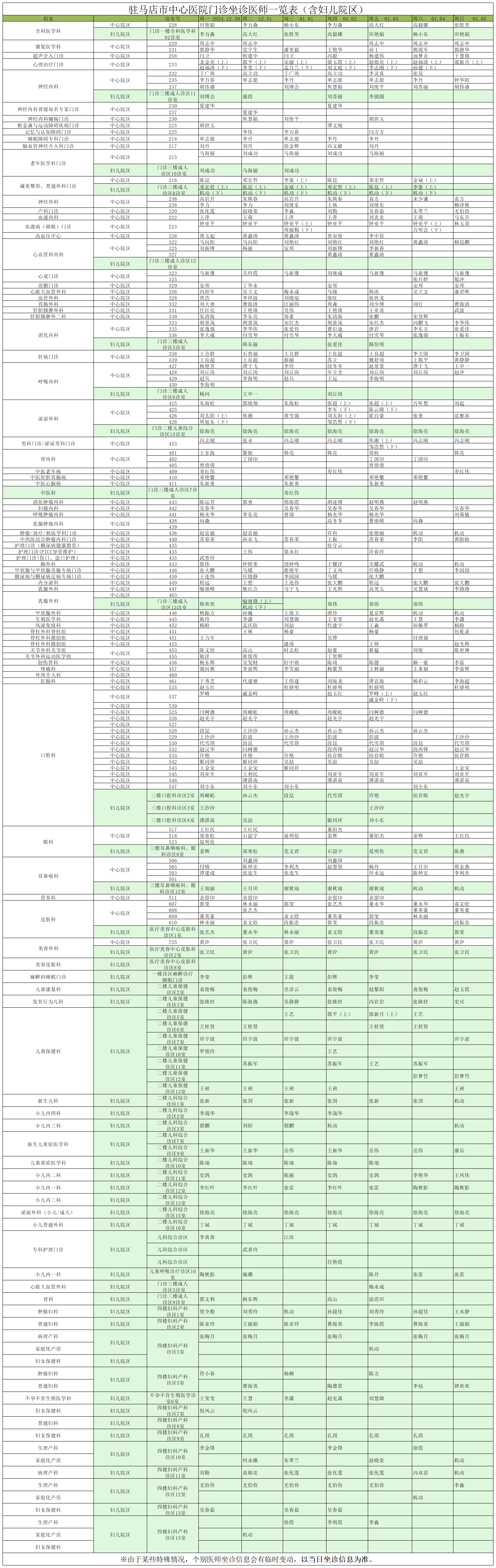 駐馬店市中心醫(yī)院門診坐診信息一覽表(含婦兒院區(qū))